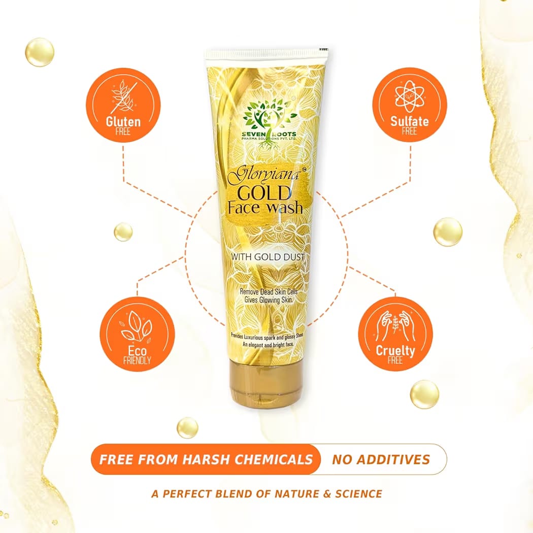 Gold Face Wash: Enriched with real gold dust, this gentle cleanser removes dirt, oil, and impurities while enhancing skin glow. It effectively eliminates dead skin cells, leaving skin fresh, soft, and naturally luminous. The sulfate-free, gluten-free, eco-friendly formula cleanses without stripping moisture.